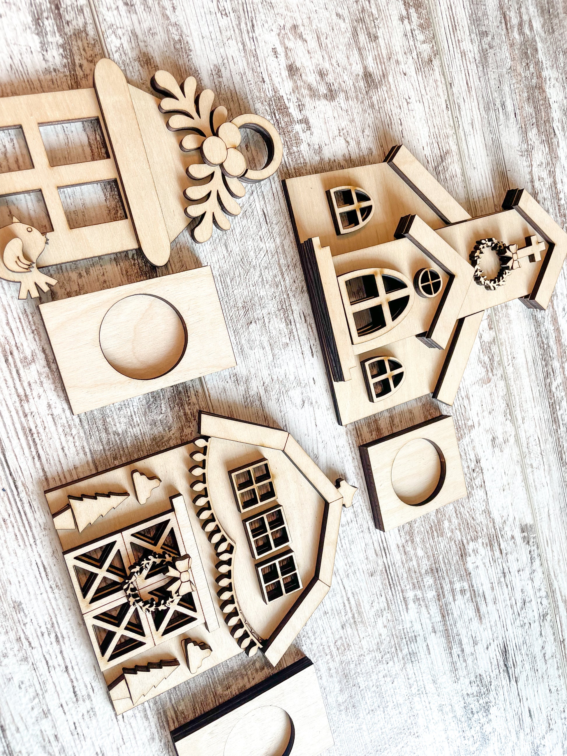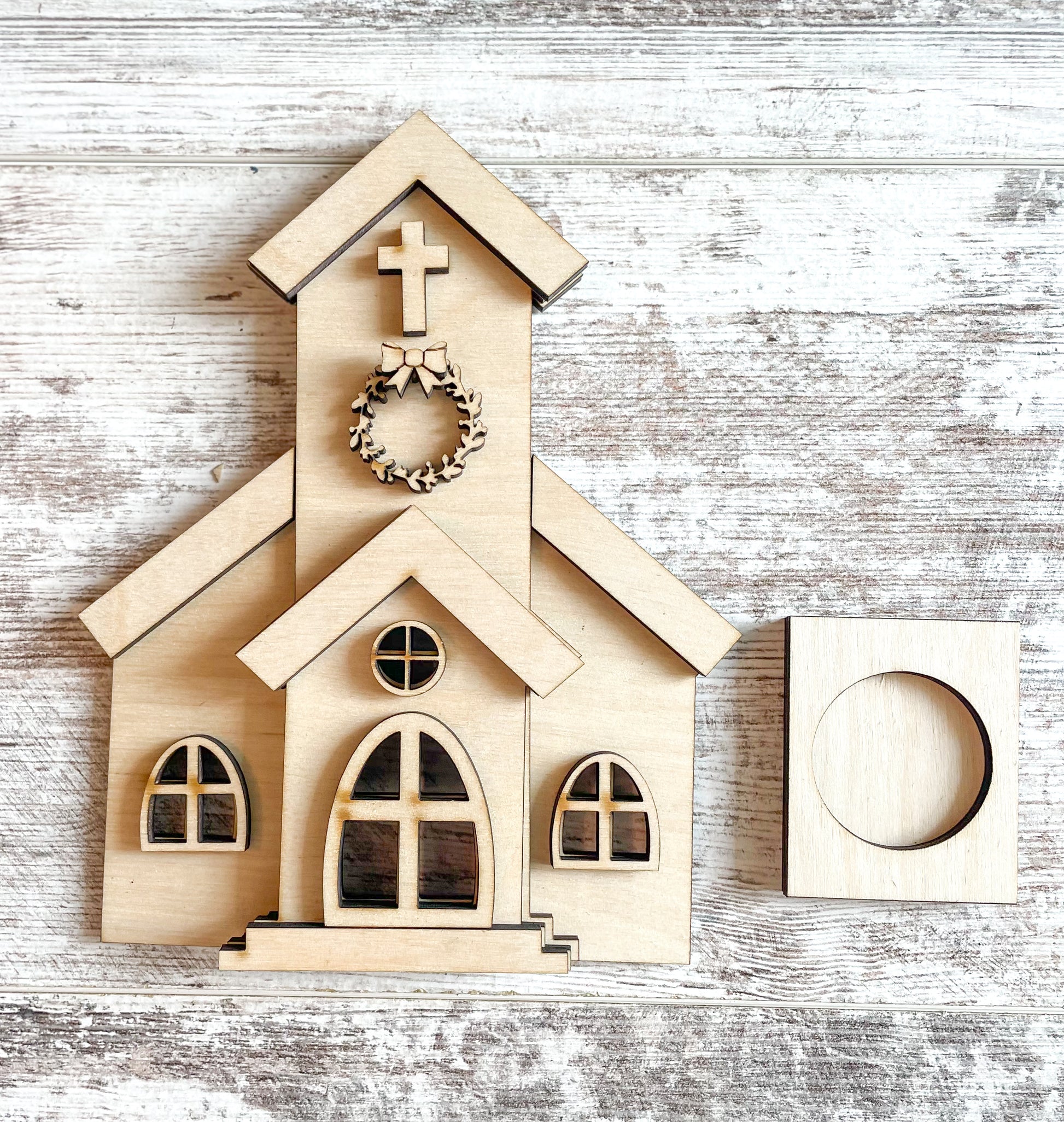 Create some holiday cheer in the summer with our Christmas in July Votive Candle Holder DIY Kit! This kit includes all of the wood pieces you need to make your own unique votive candle holders (candles NOT included). The church is about 7.5" tall, the barn is about 6" tall and the lantern is about 6.4" tall.