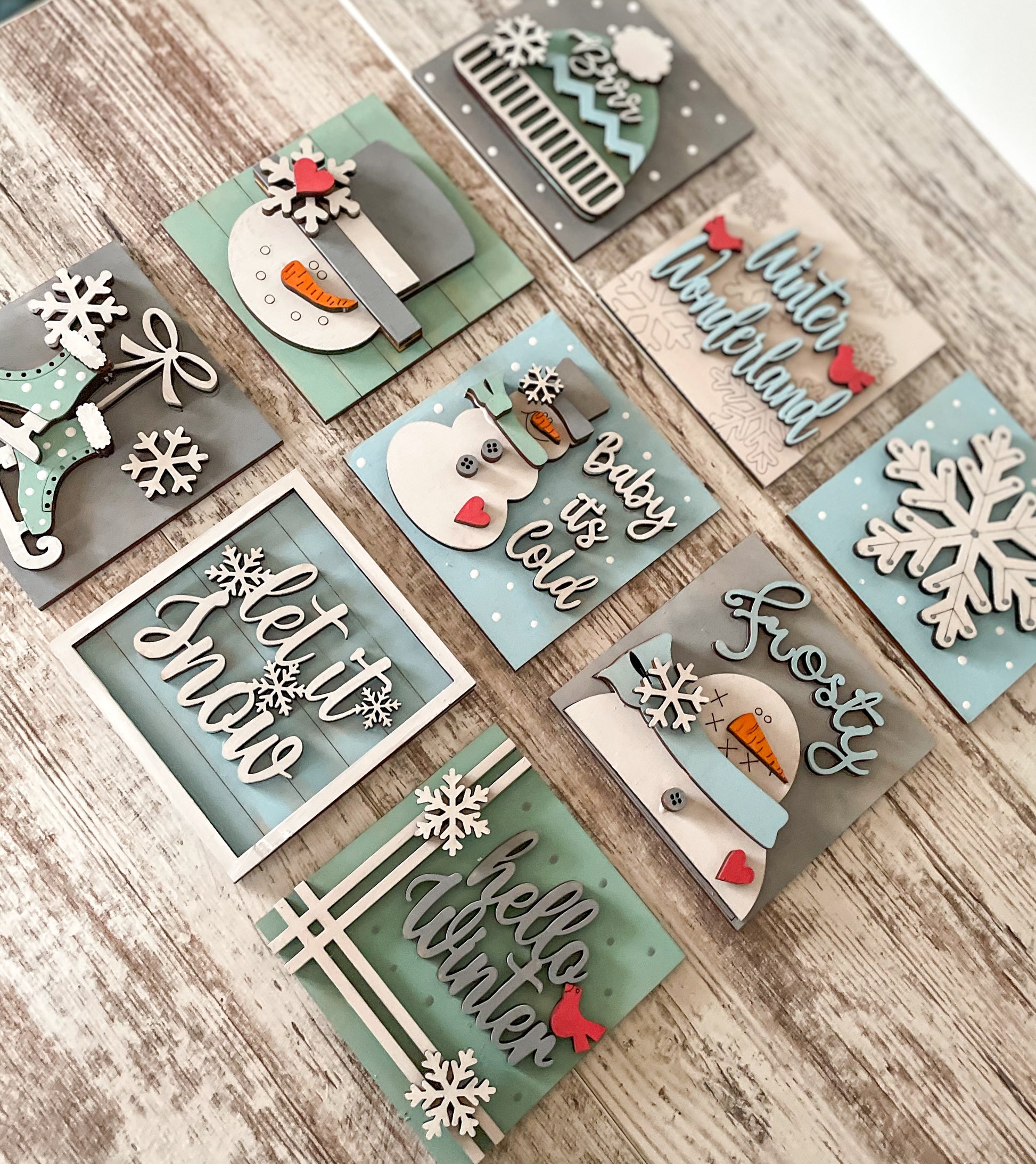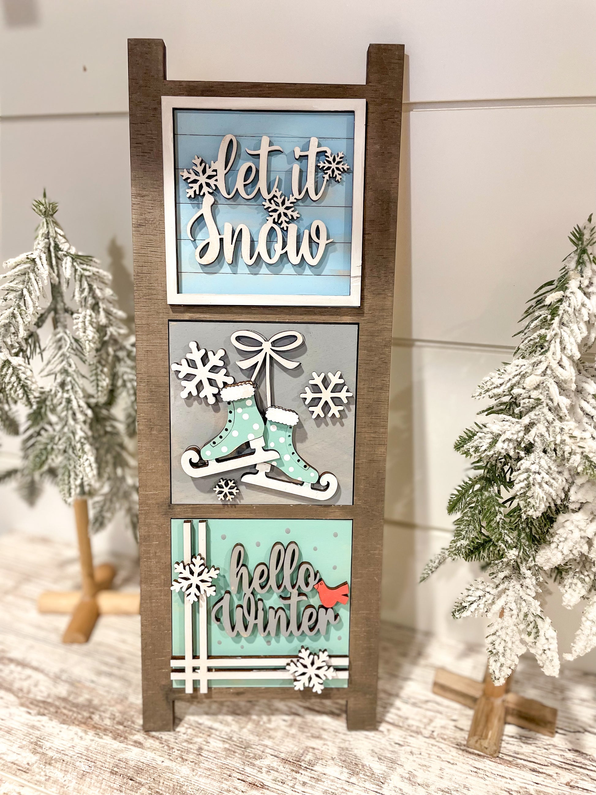 It's time to start getting our Winter decor out. Each sign is approximately 4.25" and fits perfectly in our leaning ladder. Use with the ladder or purchase a stand for them. All signs come BLANK/UNASSEMBLED. Choose your designs from the drop down menu. Please remember colors may vary due to computer settings and wood grain.